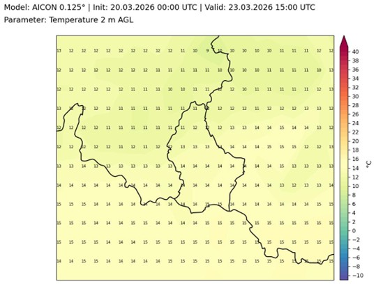 Vorhersage der Lufttemperatur in 2 m Höhe für den 23. März 2026 um 16h00 Lokalzeit vom Wettermodell AICON, initialisiert am 20. März 2026 um 01h00 Lokalzeit.