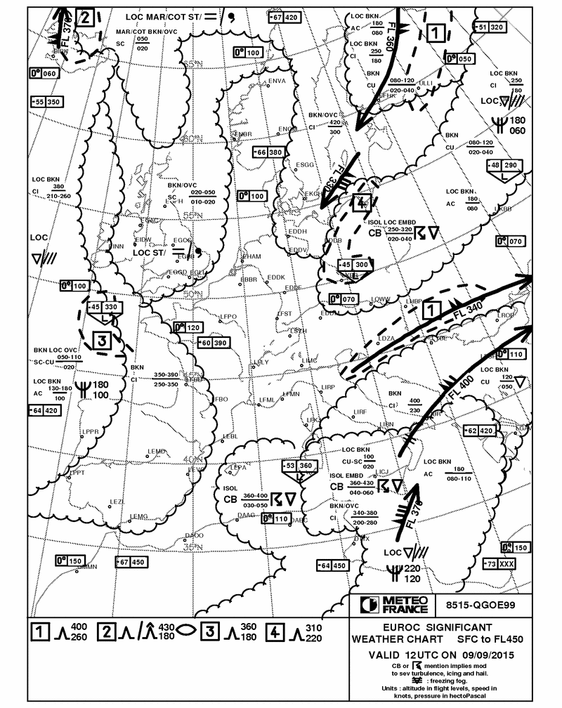 Die TEMSI Karte (Signifikantes Wetter) EUROC gibt eine Übersicht über das vorhergesagte signifikante Wetter für einen festen Zeitpunkt im Bereich Westeuropa. Diese Karte wird alle 3 Stunden von Météo France erstellt und ist gültig unterhalb der Flugfläche FL450.