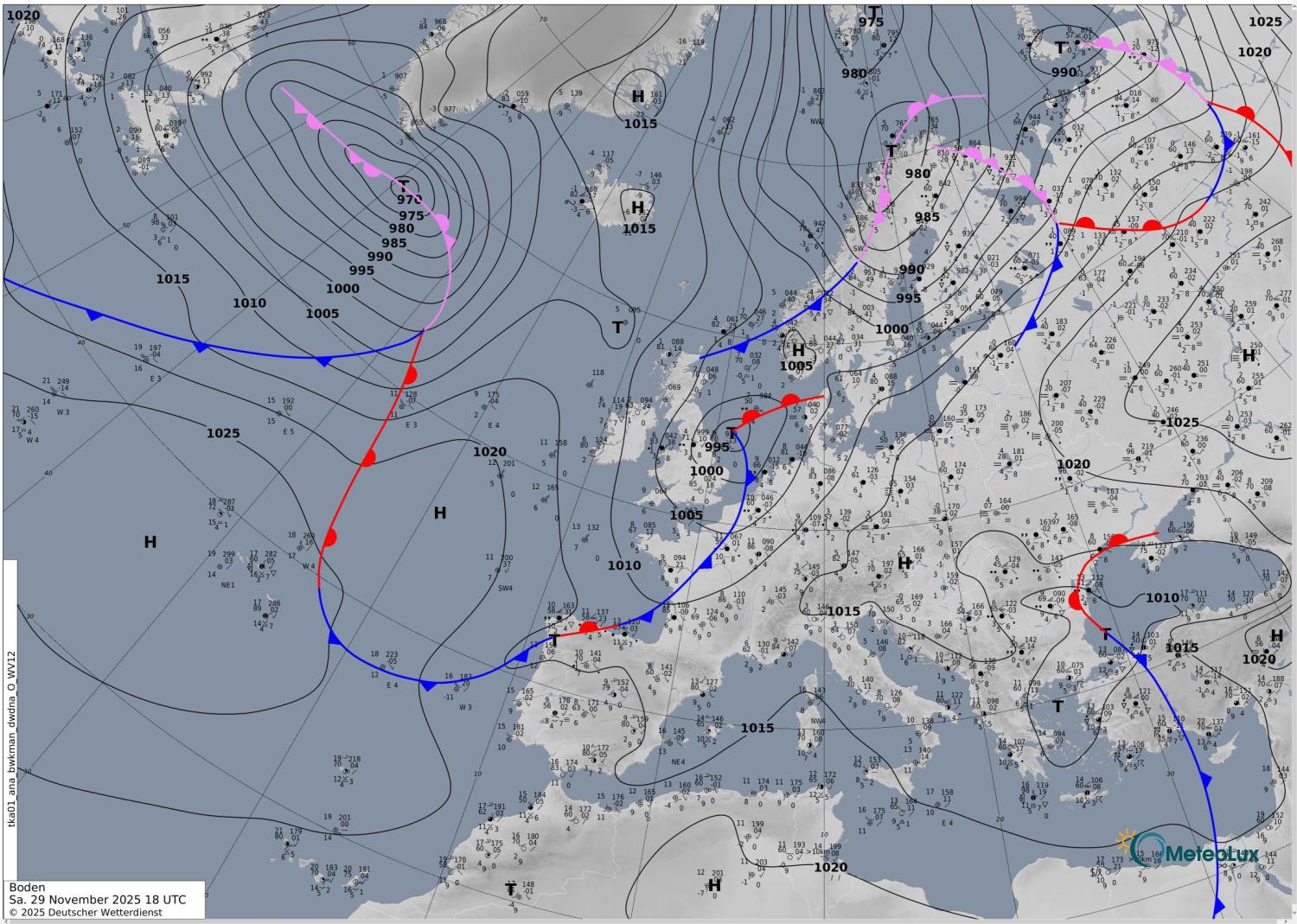 Die Kaltfronten sind mit Hilfe einer durchgezogenen Linie mit Dreiecken, die in Zugrichtung der Front orientiert sind, dargestellt.