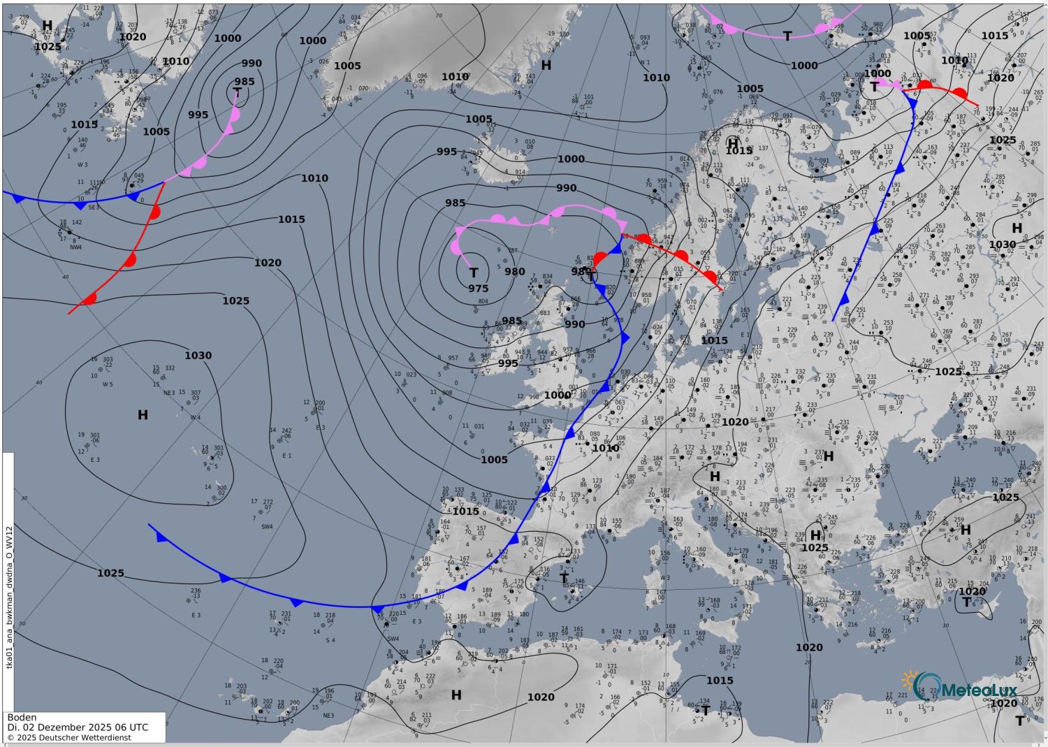 Die Kaltfronten sind mit Hilfe einer durchgezogenen Linie mit Dreiecken, die in Zugrichtung der Front orientiert sind, dargestellt.