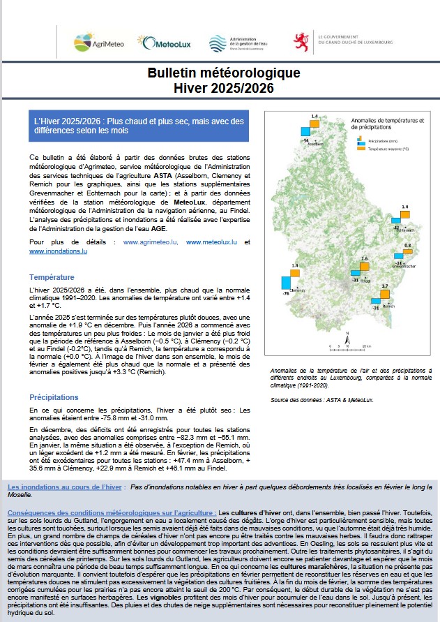 MeteoLux vous propose d’accéder aux bulletins agroclimatologiques saisonniers et annuels élaborés en collaboration avec Agrimeteo (ASTA) et l’Administration de la gestion de l’eau (AGE), basés sur le réseau de mesures de l’ASTA et la station de MeteoLux à Findel-Aéroport.