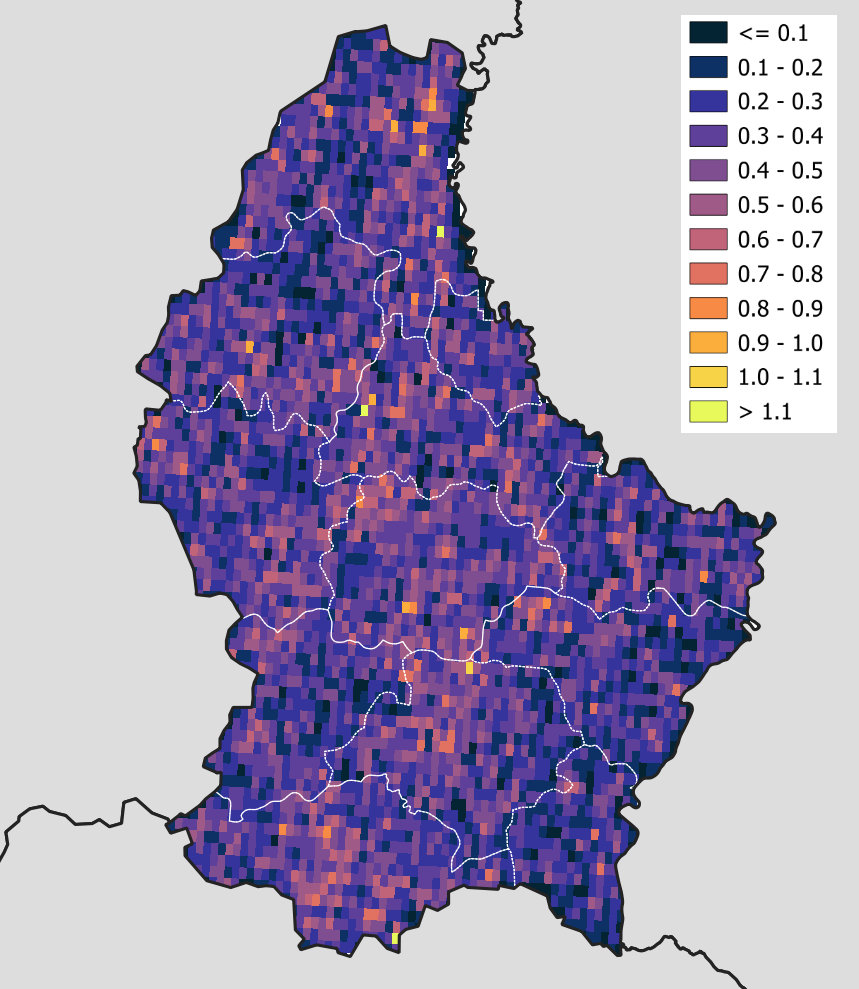 This study presents the first dedicated lightning climatology for Luxembourg, based on 12 years (2013–2024) of observations from Belgium’s BELLS lightning detection network. The analysis focuses on cloud‑to‑ground (CG) lightning and reveals a strongly seasonal and diurnal cycle, with 85% of CG flashes occurring between May and August and a pronounced afternoon–evening maximum. Mean CG flash density is moderate (0.5 km² yr⁻¹) but shows substantial interannual variability. Spatial patterns highlight elevated CG densities in southern and central Luxembourg, local hotspots near tall structures, and minimum values along the Moselle valley. Intracloud (IC) lightning, which is far more frequent, indicates a clear northwest–southeast gradient in overall thunderstorm activity, with the highest levels in the northwest.
